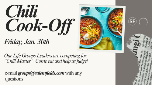 Friday, January 30th @ 6pm - Life Group Leaders will compete for 'Chili Master' in our 1st Chili Cook Off on Friday, January 30th @ 6pm. Everyone is invited to taste and judge!