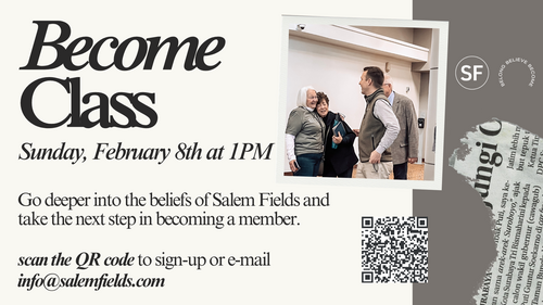 Sunday, February 8th @ 1pm - Come join Pastor James as he goes deeper into the theology of Salem Fields, and have the opportunity to become a member. Let us know you're coming by clicking HERE