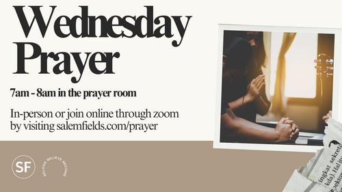 Join us for prayer every Wednesday morning at 7am. If you can't join us in-person, you can join us via Zoom HERE. If you are unable to join us in person or on Zoom, you can pray at home, in your car, or at your desk. Let's make prayer a priority in shaping our story. Also, we will be airing our 'Prayer Made Simple' podcast in the near future.