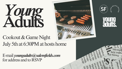 Cookout and game night! We will gather at Nate & Bri's home. Let us know if you plan to attend by emailing